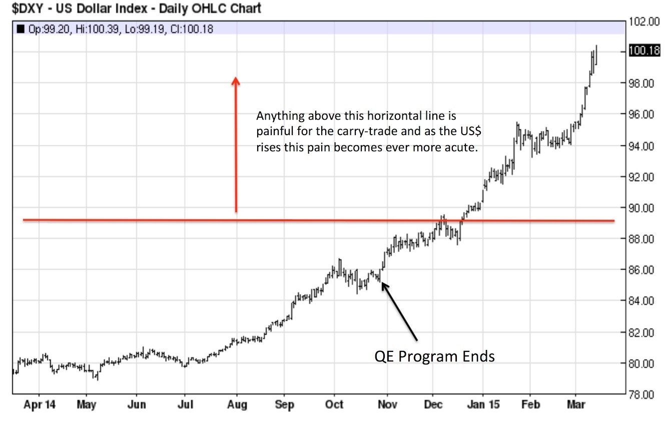 Since then the US$ has surged approximately 25% in value, this has seriously compounded the pain in the massive carry-trade funding taken out in US$. A closer look at the US$ chart over the last 12 months below….