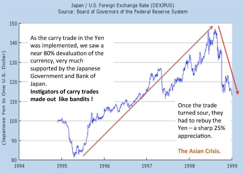This trade effectively feeds on itself and became self-fulfilling, especially with the full support of the Bank of Japan and its intention to weaken it’s currency at the time. As the trade becomes ever more popular it effectively devalues the ‘carry’ currency – as borrowers sell the Yen and purchases the currency in which they are investing into at a higher yield than the borrowing costs.