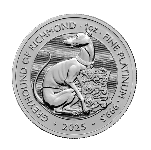 The 2025 1 oz Tudor Beasts Greyhound of Richmond Platinum Coin from The Royal Mint continues the celebrated Royal Tudor Beasts series, honouring the rich legacy of the Tudor dynasty through exceptional craftsmanship. Struck in 999.5 fine platinum, the coin bears the official portrait of His Majesty King Charles III on the obverse.