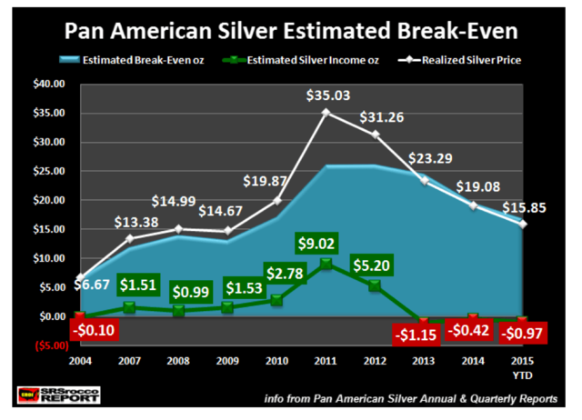 Even though Pan American Silver has been able to lower their break-even by extensive cost cutting and lower energy prices, we can see they still lost 97 cents an ounce at a realized price of $15.85 in 2015 versus losing 10 cents an ounce in 2004 when the market price of silver was $6.67.