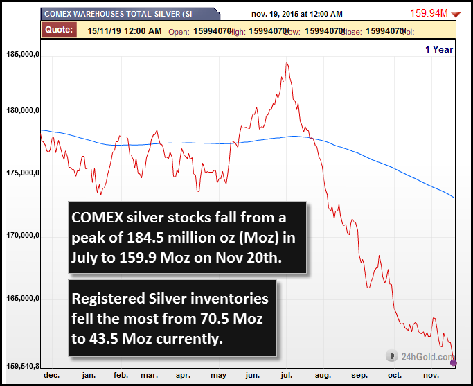 However, to see the COMEX silver inventories continue to decline since the middle of October is quite strange. If demand for physical silver investment has subsided since the middle of October as well as industrial demand, you would think we would start to see a build of silver inventories at the COMEX.