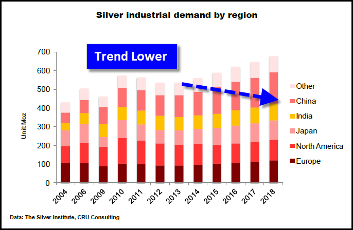 Industrial silver consumption will continue to fall in the future. Sure, we could see a brief pop in consumption for a year or so, but the overall trend will be lower. So, all the investors or analysts who are forecasting the future silver price based on industrial demand… WAKE UP. Forget industrial demand and focus on physical investment demand. That will be the key going forward.