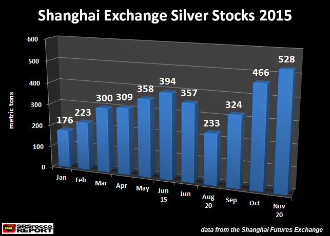 Now, while COMEX silver inventories continued to decline, the opposite took place at the Shanghai Futures Exchange (SHFE). SHFE silver inventories bottomed on August 18th at 233 metric tons (mt), then continued to grow over the past three months to the present 528 mt.