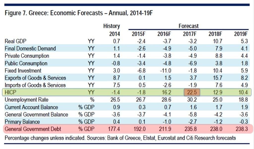 In other words, Citi predicts that by 2017 Greece will have hyperinflation even if it remains in the Eurozone.