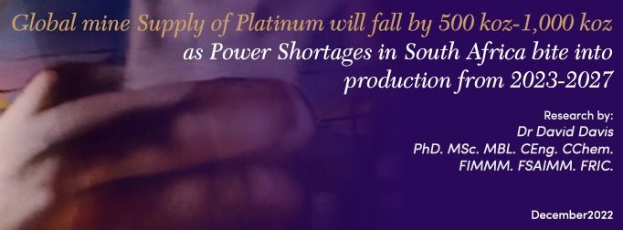 This report by Dr David Davis focuses on the future quantum of global PGMs and Platinum mine supply together with the heightening risks associated with their supply. Note that South Africa, Russia and Zimbabwe represent around 73%, 10% and 8% of global Platinum supply, respectively. In this regard, it is immediately obvious that circa. 91% of the world’s Platinum supply comes from just three countries. This geographical and political concentration of supply can be described as ‘precarious’ at best. It is noted that global mining is not without risk. However, PGM and Platinum mine production faces additional existential risks and I refer to these “additional existential risks” in this report. For South Africa, one of the many additional existential risks is the looming and potentially catastrophic energy crisis.