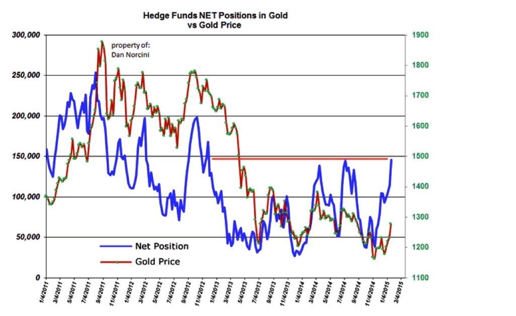 This next chart is the NET POSITION of the largest group of speculative forces in the markets today and that is the Hedge Funds. Overlaid upon that graph is the price of gold.