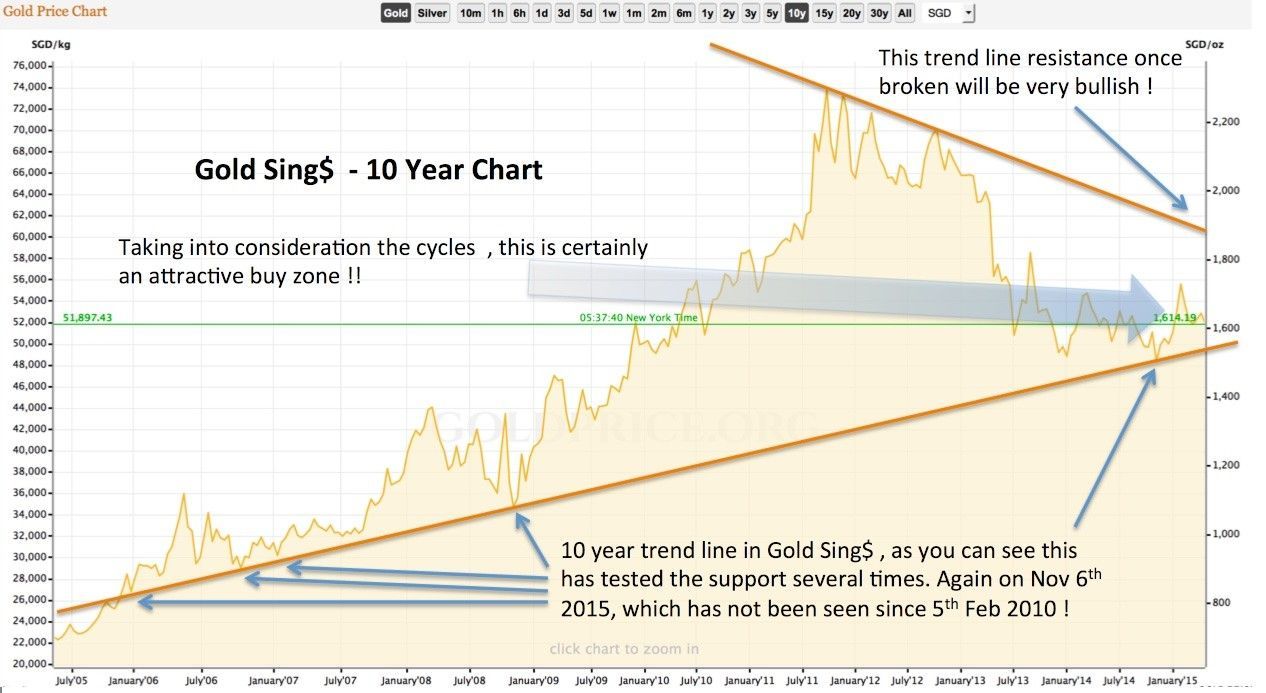 10 Year Chart of Gold ag Sing$ – A clear trend line is in place……