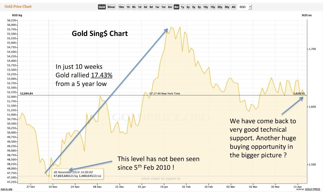 On the 6th November 2014, near 6 short months ago Gold retested a level against the Singaporean dollar not seen since the 5th February of 2010 (a fantastic buying opportunity indeed). An extremely healthy correction within the greater secular bull market this metal is presently in.