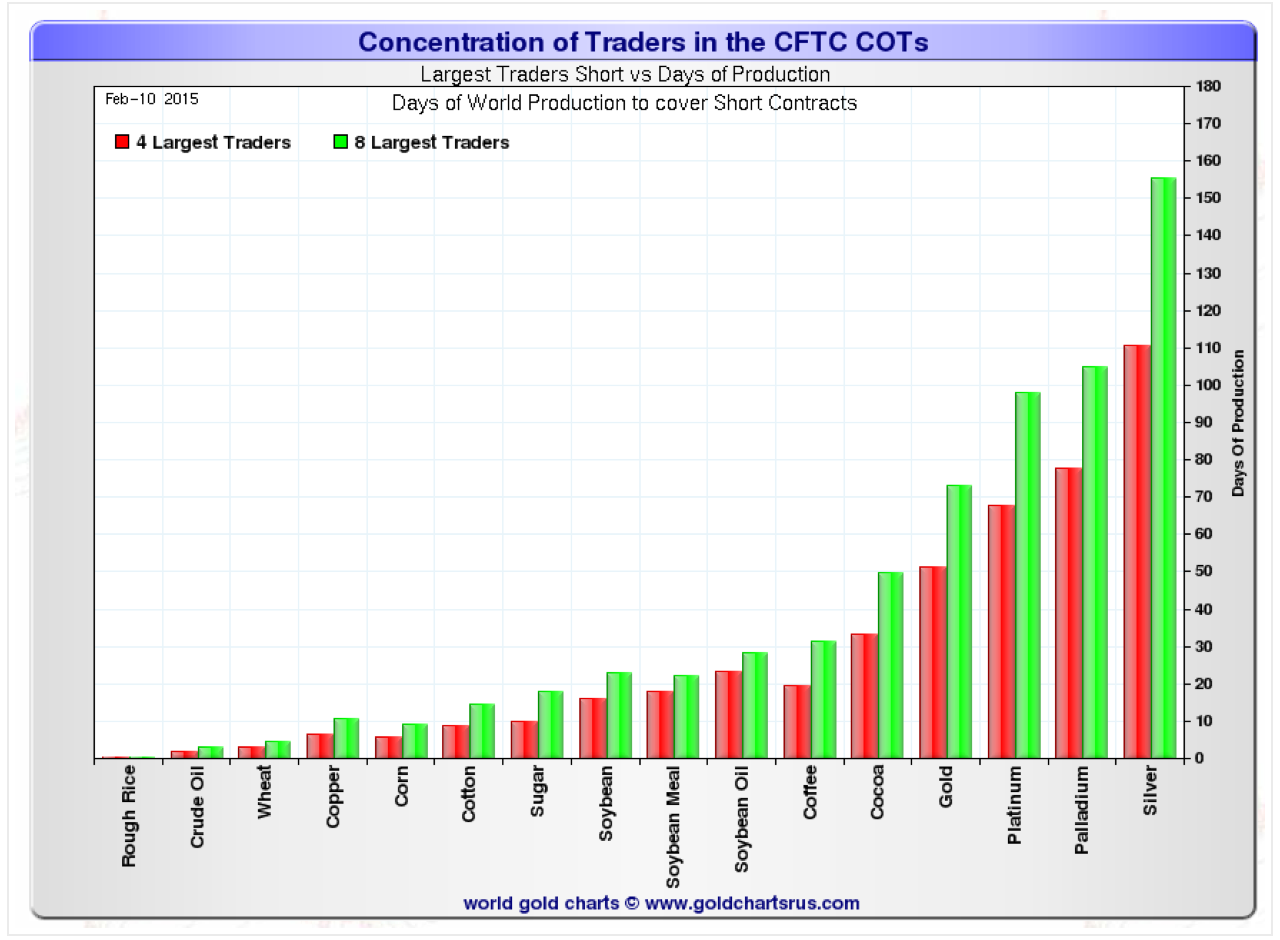 If NYMEX crude oil experienced 53 days of world oil production (93 million barrels a day) being sold in one week, as just occurred in COMEX silver, that would be the equivalent of 5 billion barrels of oil or 5 million NYMEX futures contracts. NYMEX crude oil is the largest oil futures contract in the world and has a current total open interest of around 1.6 million contracts and it would be impossible for any group of speculators to sell or buy 53 days of world production in a year or longer, no less in a week as just occurred in COMEX silver. In terms of the concentrated short position of the 8 largest traders in NYMEX crude oil, it comes to less than 4 days of world oil production, compared to the 163 days of production held short in COMEX silverthat just 8 traders on the COMEX hold net short, the largest concentrated short position of any regulated commodity.