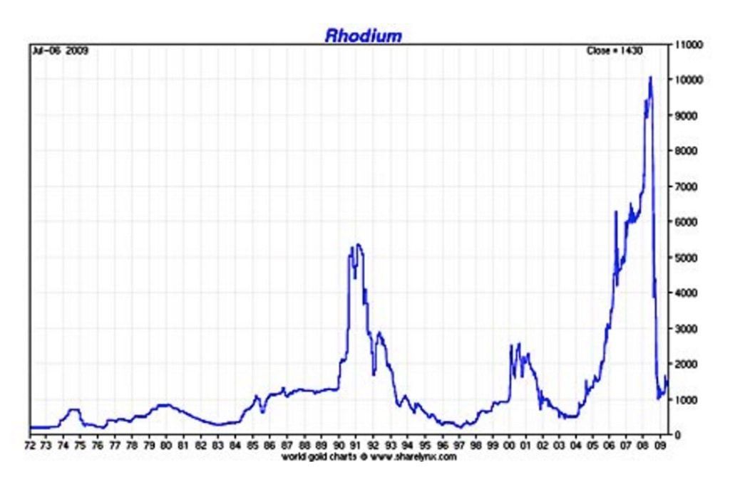 From a $440 low in January 2004, prices ballooned near 23-fold to more than $10,000 over five years as industrial users hoarded the metal amid concern that South African mine supply would fall. Platinum reached a record $2,300 in 2008 (Rh was 4 times more expensive than Platinum) and palladium reached a six-year high.