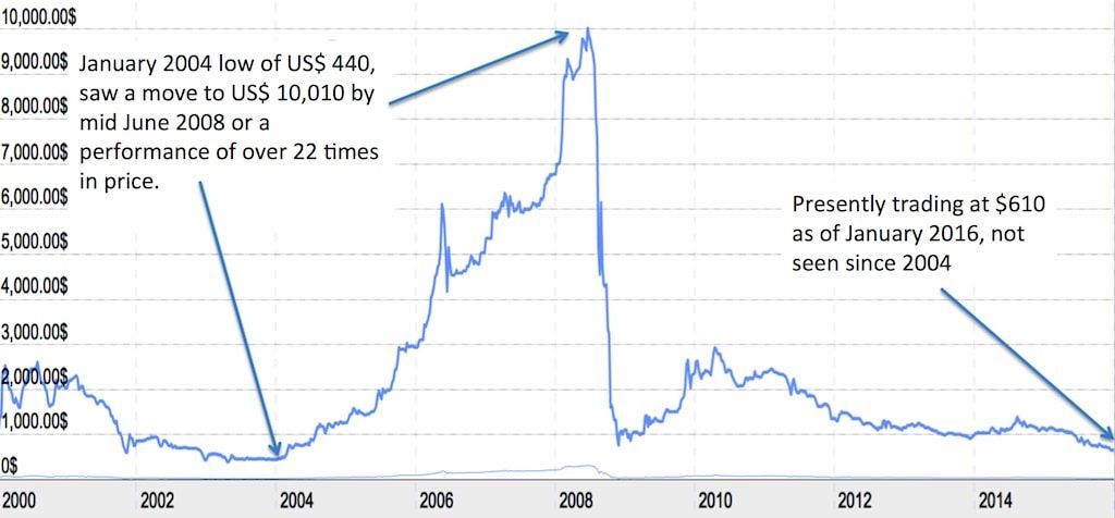 A rally from US$ 200 to over US$ 800, a 4 fold increase.