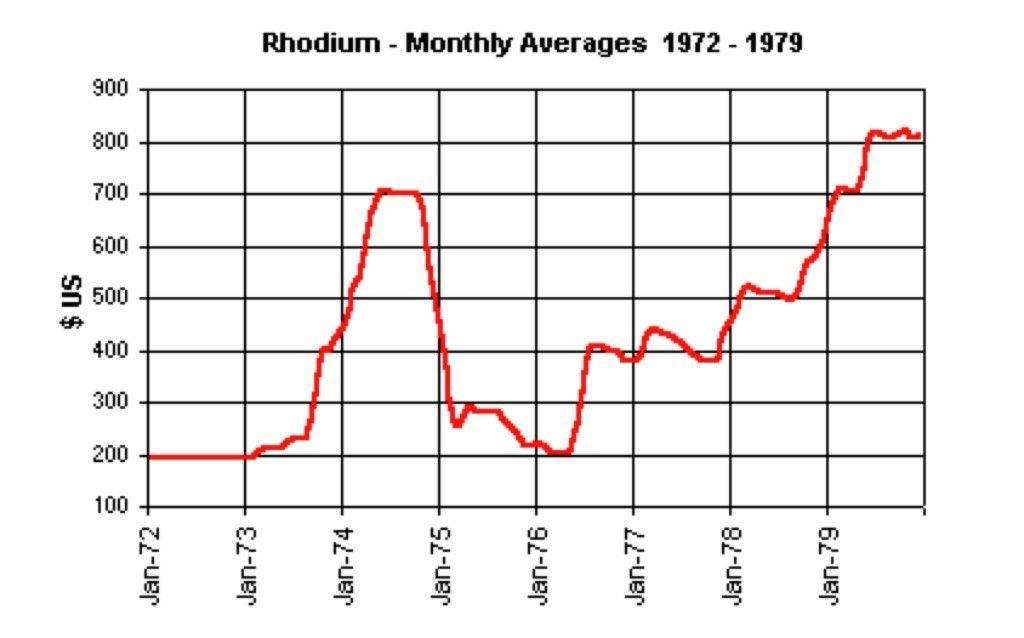 As the title suggests Rhodium (Rh) is a rare metal, the silvery corrosive resistant metal is used mostly in catalysts to clean emissions and pollutants from cars. The price of Rh has certainly been on a roller coaster ride these last 40 years drifting from enormous overvaluations to extreme undervaluation’s, where in fact we presently find ourselves today !