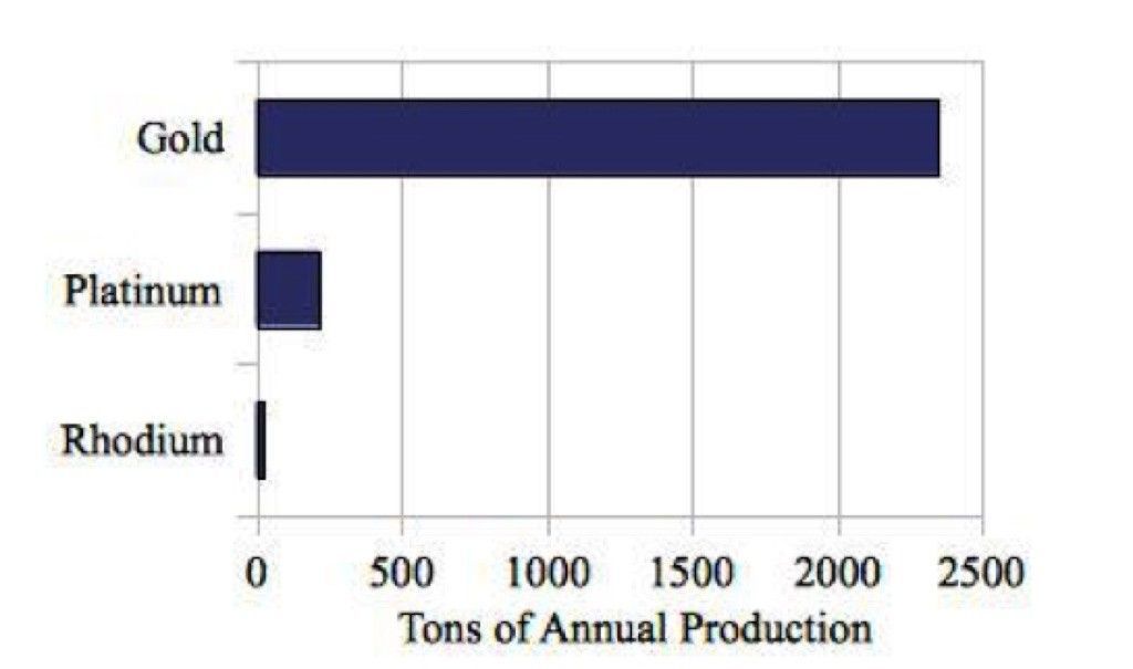 Annual production of rhodium is extremely limited. Only about 25 tons of rhodium are mined each year. Compare that to the 2,350 tonnes of gold mined in 2014.