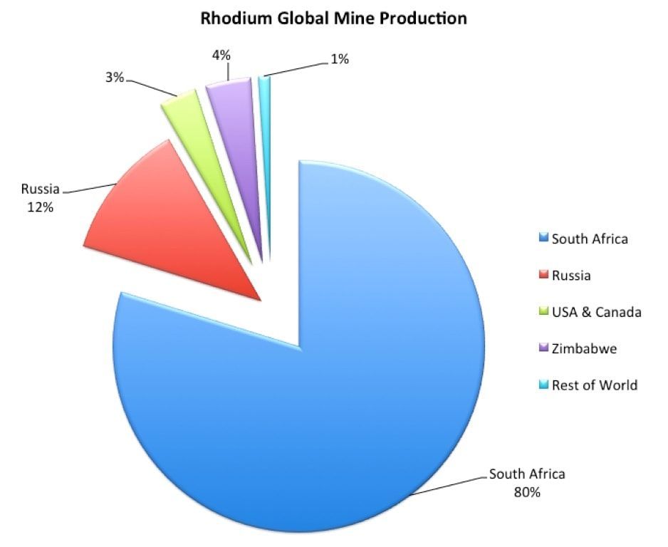 There are less than ten significant rhodium producing mines in the world, most of which are located in South Africa, which supplies over 80% of the world’s demand for rhodium.