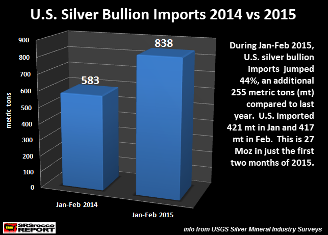 During Jan-Feb 2015, the U.S. imported 838 metric tons (mt) of silver bullion versus 583 mt last year. Moreover, I mentioned that overall demand for silver in the first quarter of 2015 is either flat or down compared to last year. So, why would the U.S. silver market need additional silver bullion if demand is lower? Who is acquiring this silver… and why?