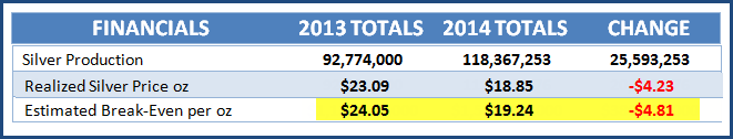 As we can see from the table above, the group sold nearly 21 million oz (Moz) more silver in 2014 than 2013, but their total revenue only increased $282 million from $3.1 billion to $3.4 billion. Basically, the group sold 23% more silver in 2014 and was awarded with a paltry 8% increase in total revenue.