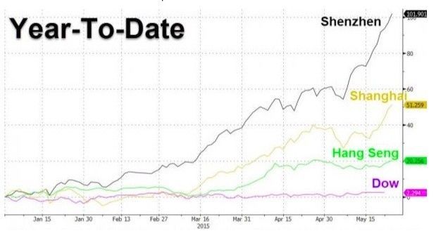 As you can see from the chart above the Shenzhen has appreciated 100% year to date 2015. The Chinese markets have benefitted enormously from a number of factors, one of them being money re-directed from the falling housing market.
