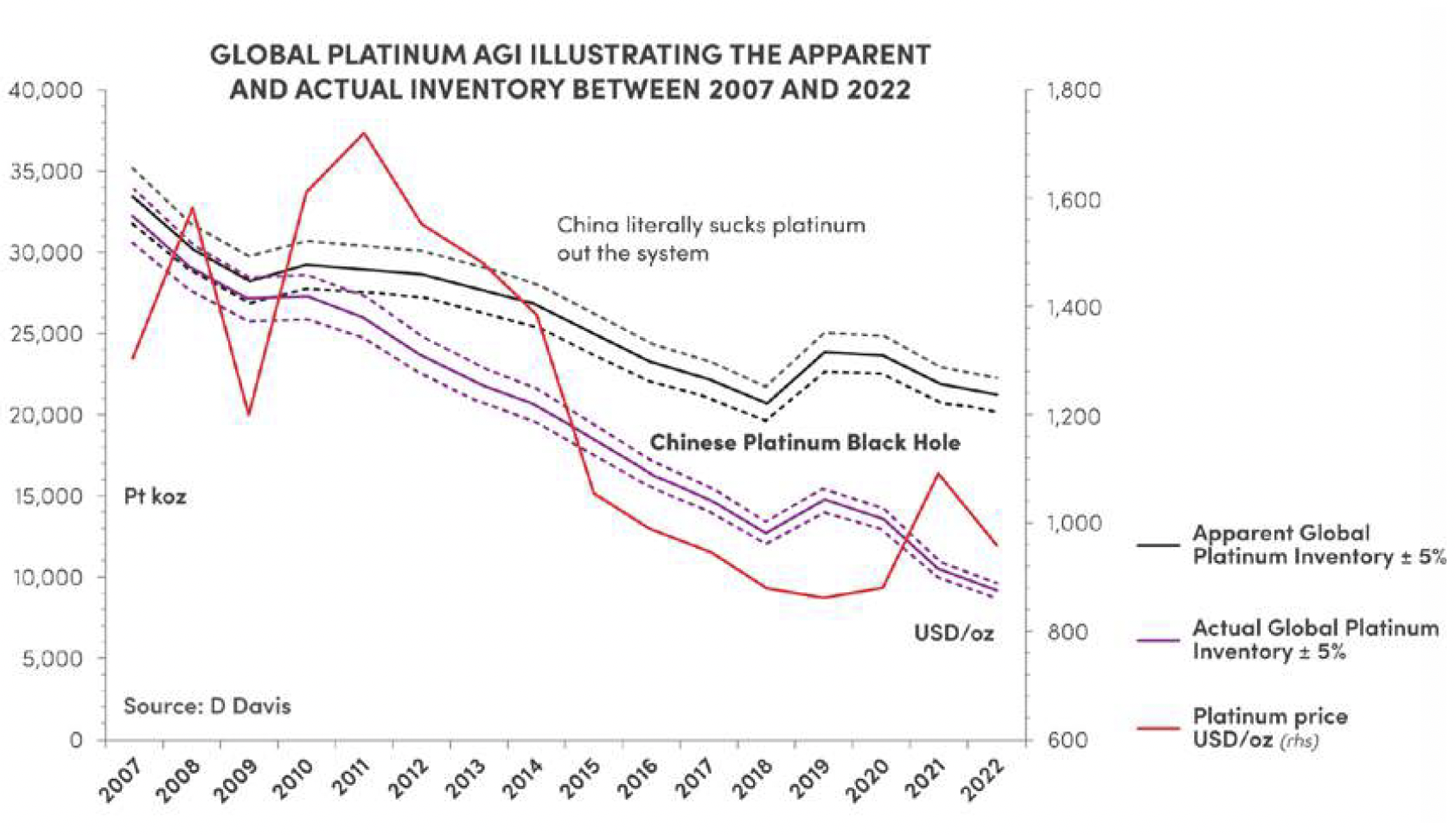 The Figure below illustrates the apparent and actual global AGI. The apparent AGI includes China’s AGI, whereas the actual AGI excludes China’s AGI. The area between the two AGIs represents the Chinese ‘black hole’. It shows that the actual global platinum AGI is declining at a pace, spurred on by the quantum of additional imports into China. My calculations indicate that by 2022 China’s AGI had grown to around ~12moz, which represents ~57% of the apparent global platinum AGI of 21.2moz. It is interesting to note that the WPIC reported platinum imports into China over demand, and its ‘estimated’ impact on AGI, which amounted to some ~80% of total AGI.