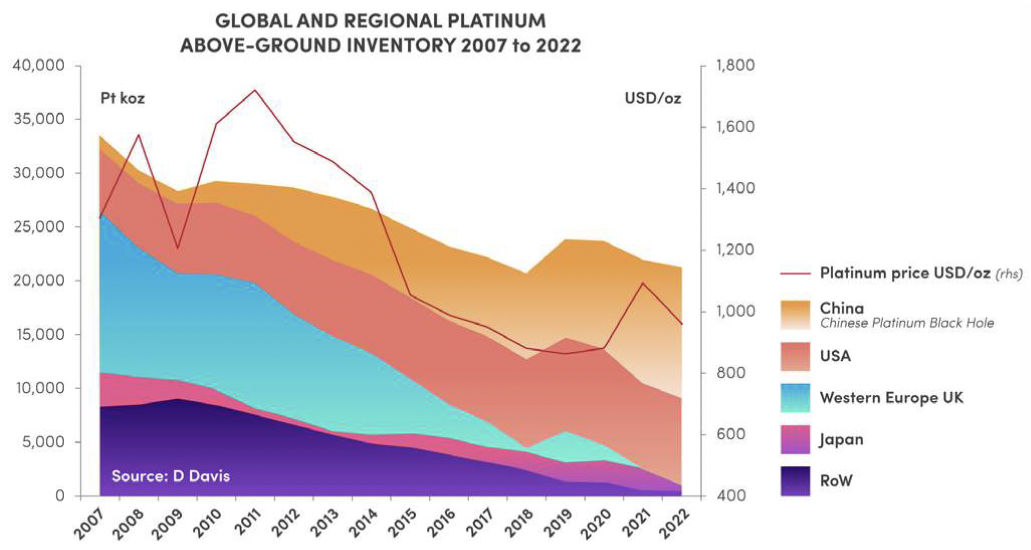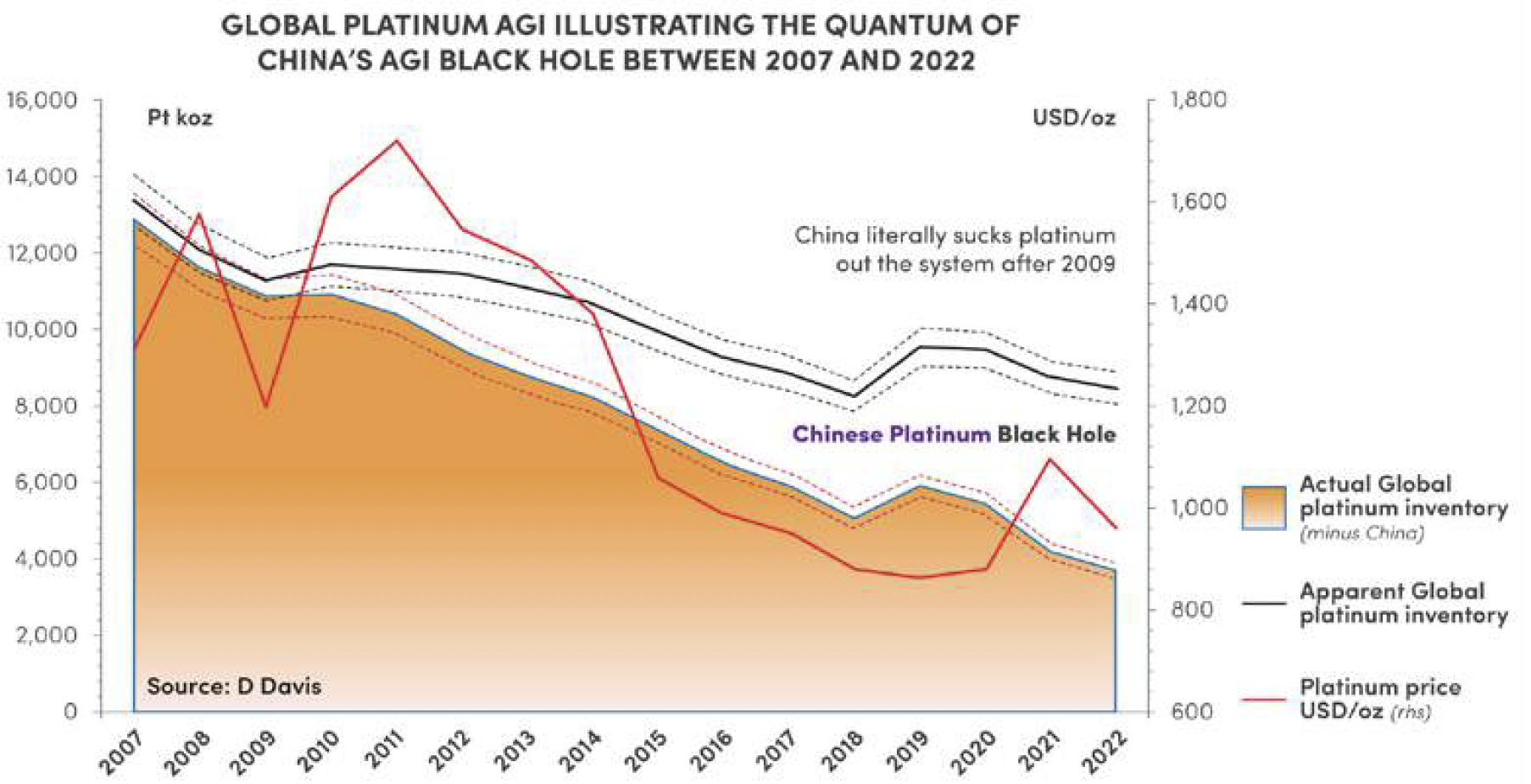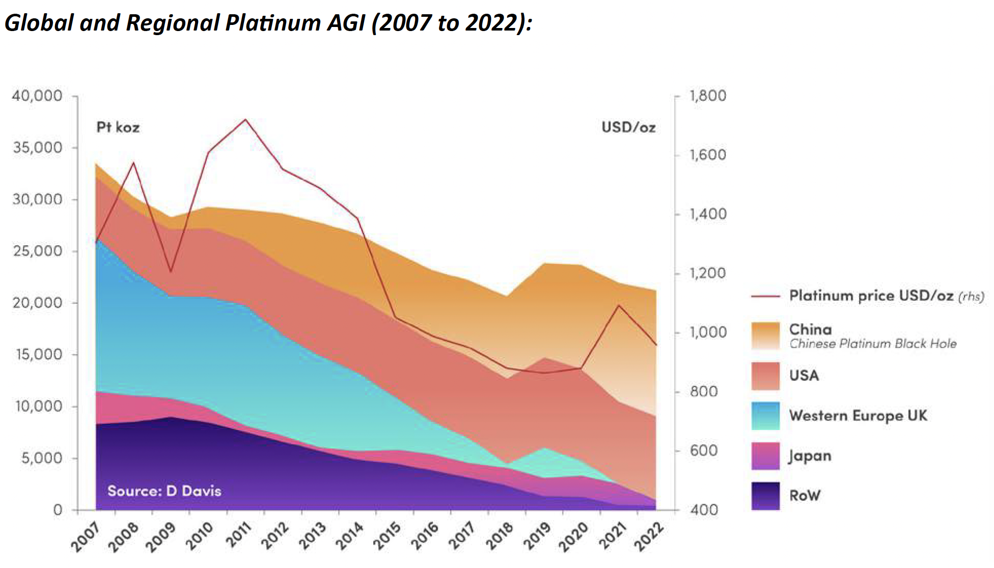 • China AGI has absorbed ~12moz, which represents ~57% of the apparent global platinum AGI of ~21.2moz. This is a catastrophic quantum of platinum that will be lost to the Western world, which will undoubtedly impact the rate of global decarbonisation and in turn put significant upward pressure on the price of platinum.