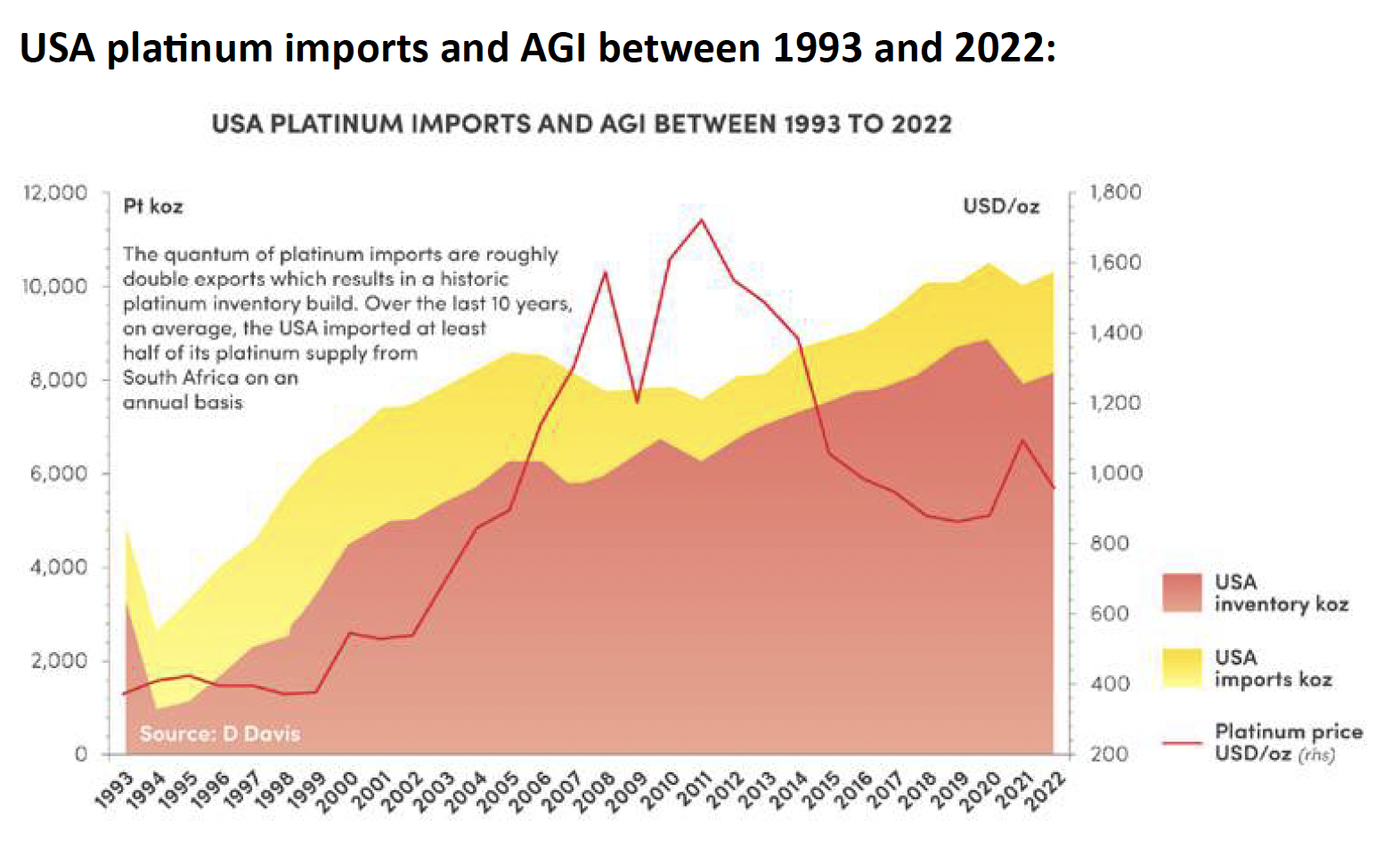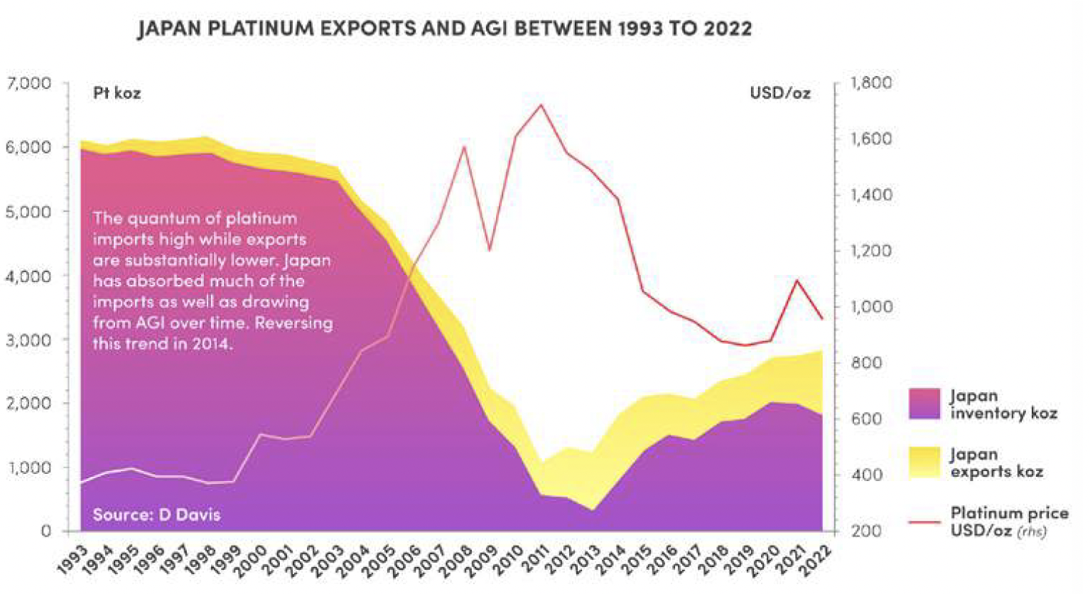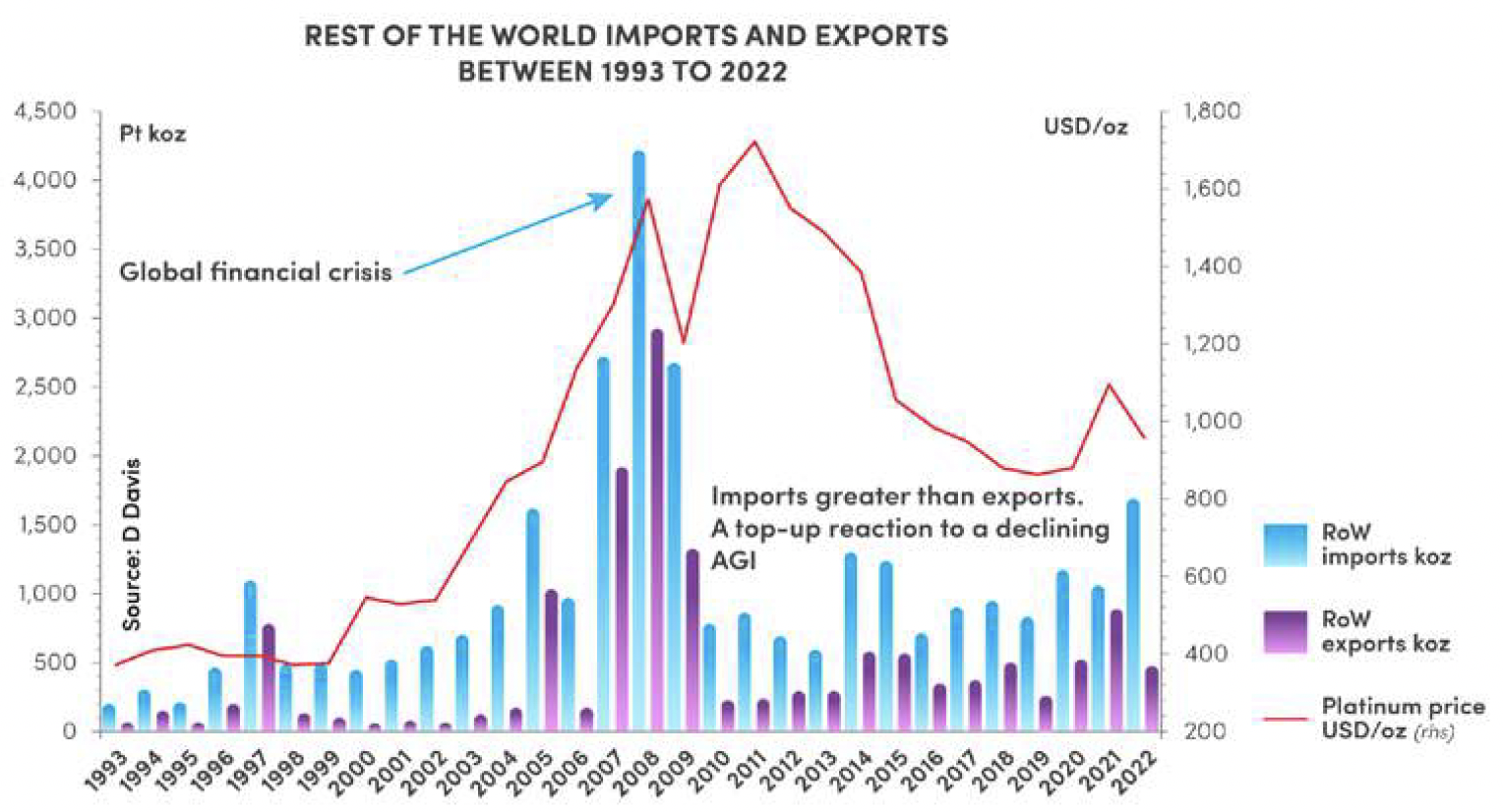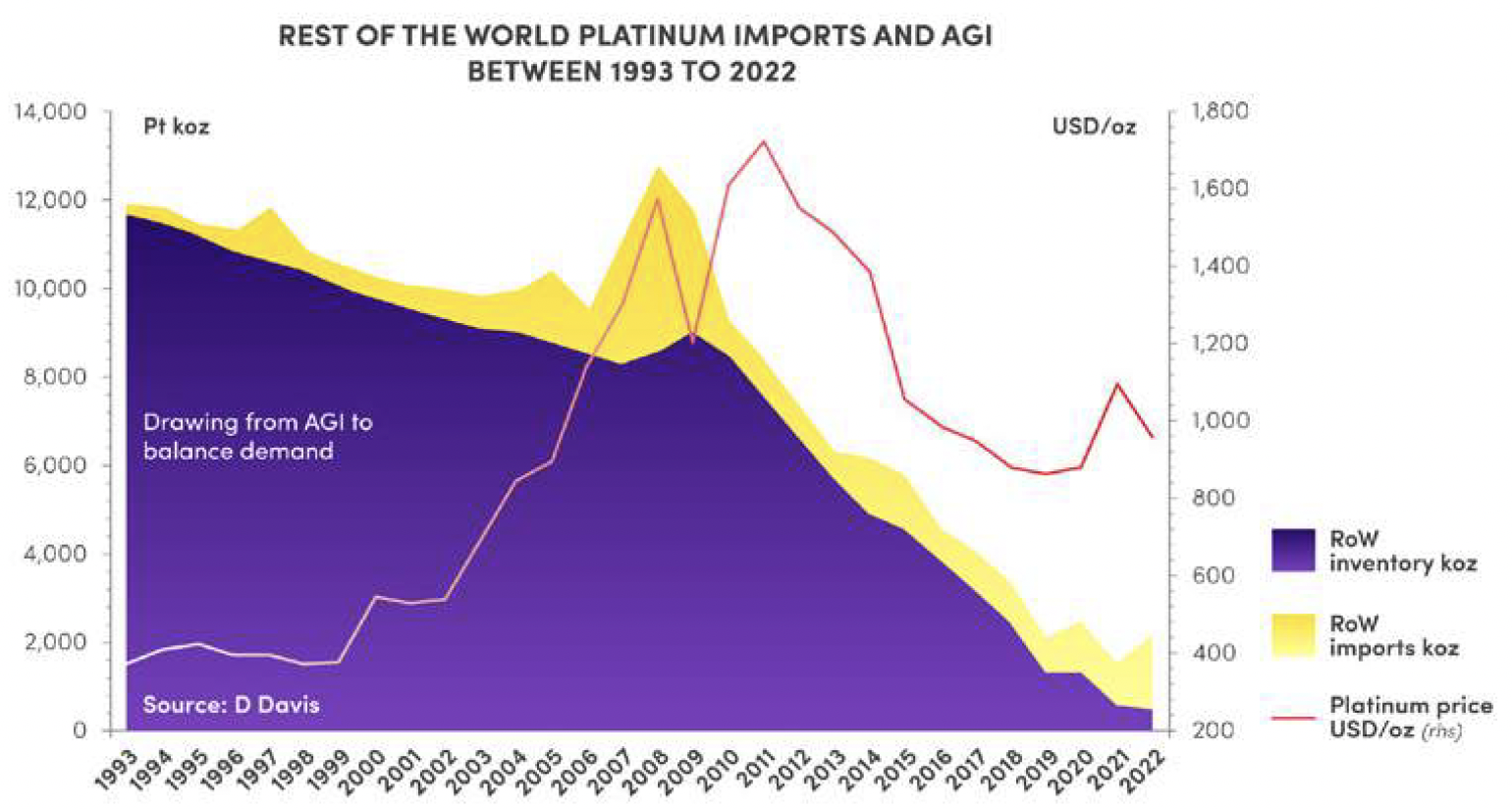 In this conversation, I focus on the quantum of platinum AGIs by region together with the quantum of platinum imports and exports. This data is illustrated graphically, which best shows the structural changes in AGI between 1993 and 2022. I have kept comments on ‘events’ that impacted platinum over this period to a minimum. The impact on price is obvious.