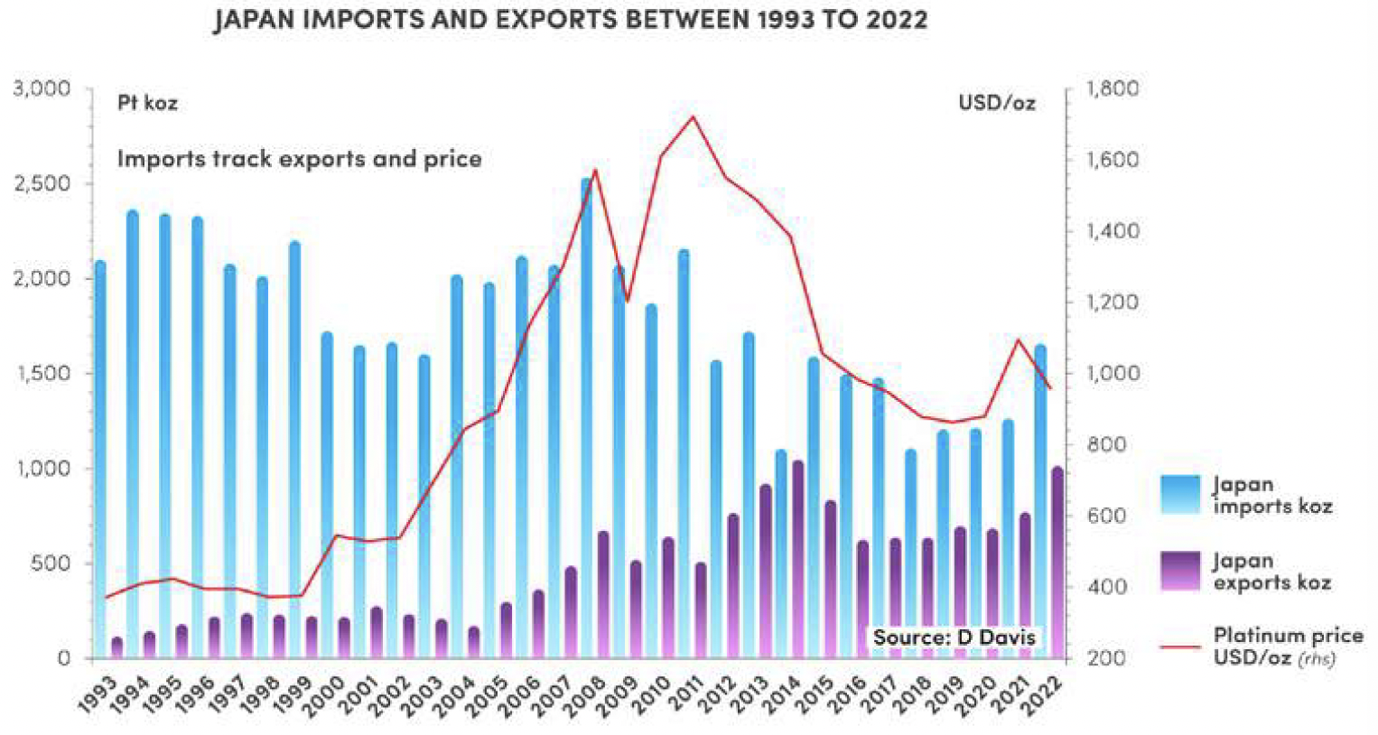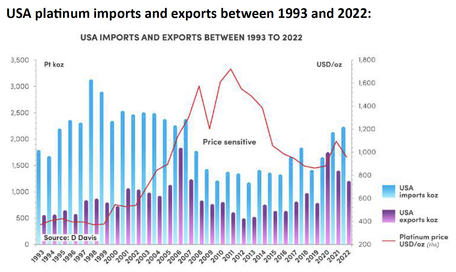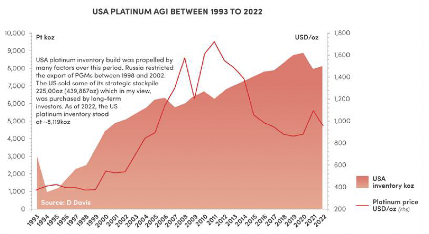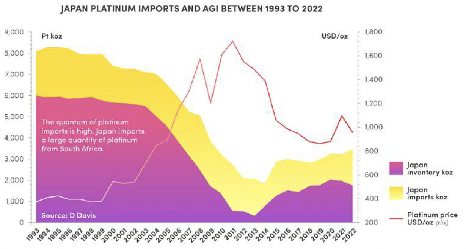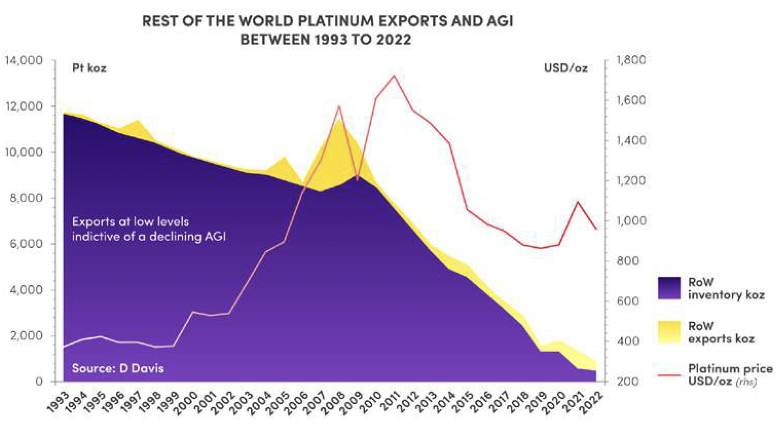 In this conversation, I focus on the quantum of platinum AGIs by region together with the quantum of platinum imports and exports. This data is illustrated graphically, which best shows the structural changes in AGI between 1993 and 2022. I have kept comments on ‘events’ that impacted platinum over this period to a minimum. The impact on price is obvious.