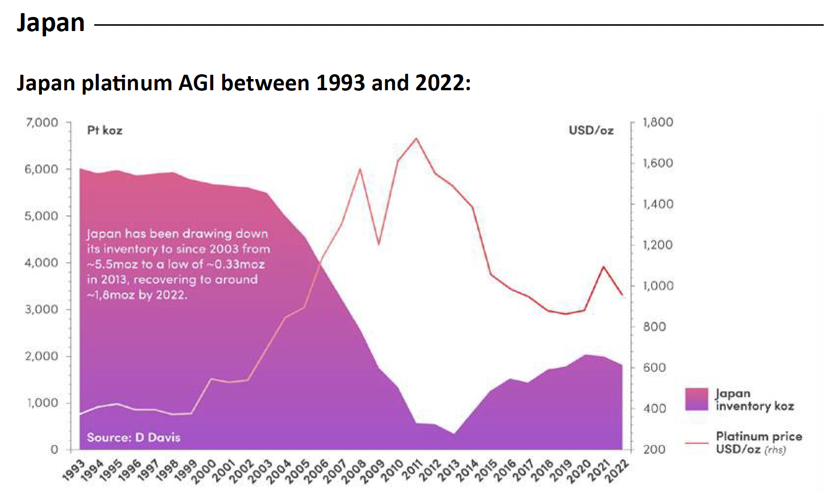 For Western Europe and the UK, the platinum AGI has diminished into negative territory (the red zone) and the Rest of the World is about to follow. Western Europe plus the UK are considered the hubs of automotive platinum demand (according to the World Platinum Investment Council). Over the same period, the USA has built its platinum AGI to some ~8moz and Japan’s AGI was around ~1.8moz in 2022. This description is illustrated below.