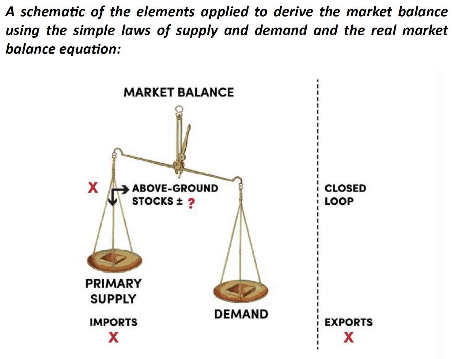 A schematic representation of the elements applied to derive the real market balance and the simple equation are illustrated below. It should be noted that the real market balance uses quantifiable information except for demand, which is supplied by PGM research organisations.