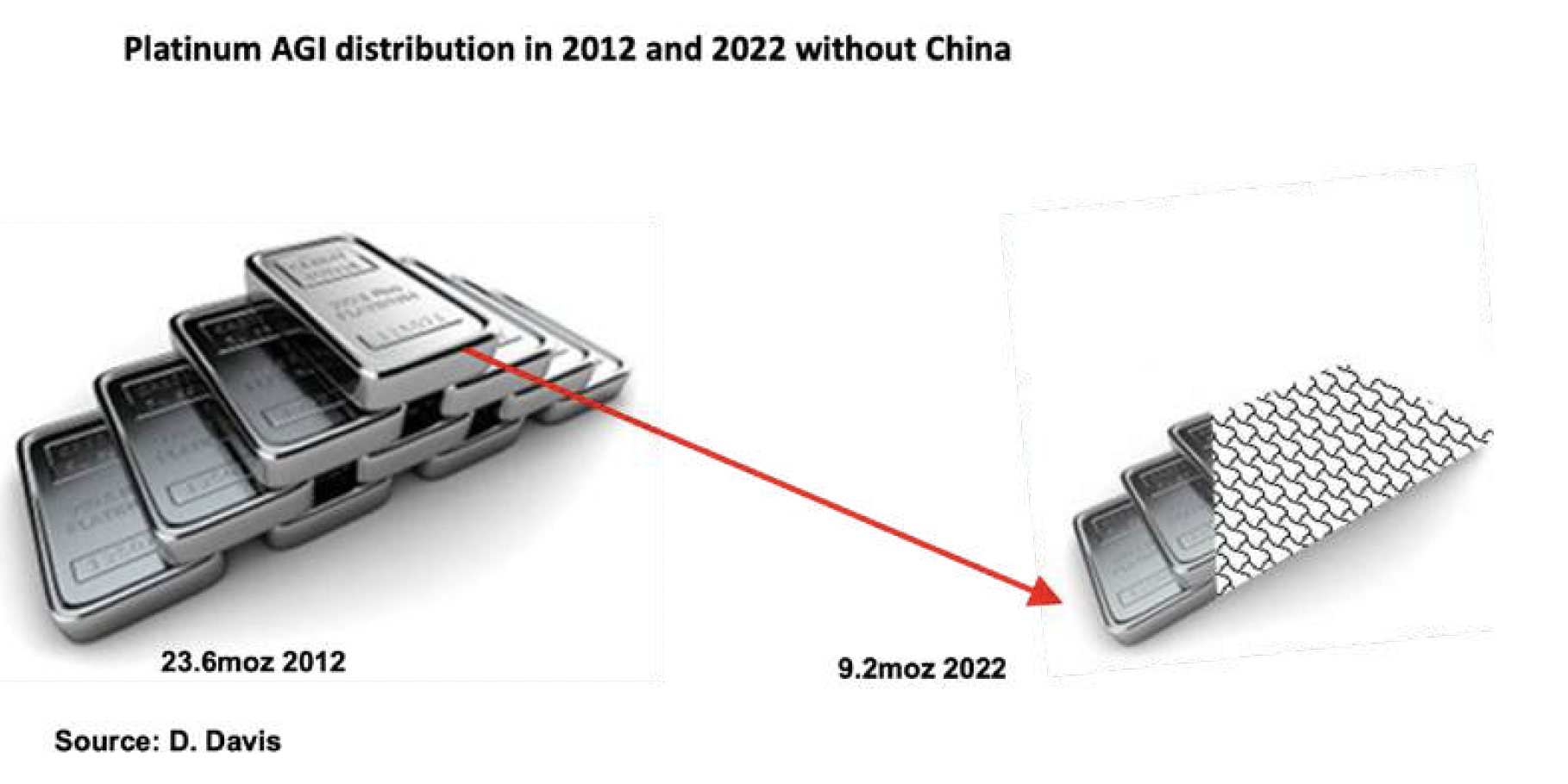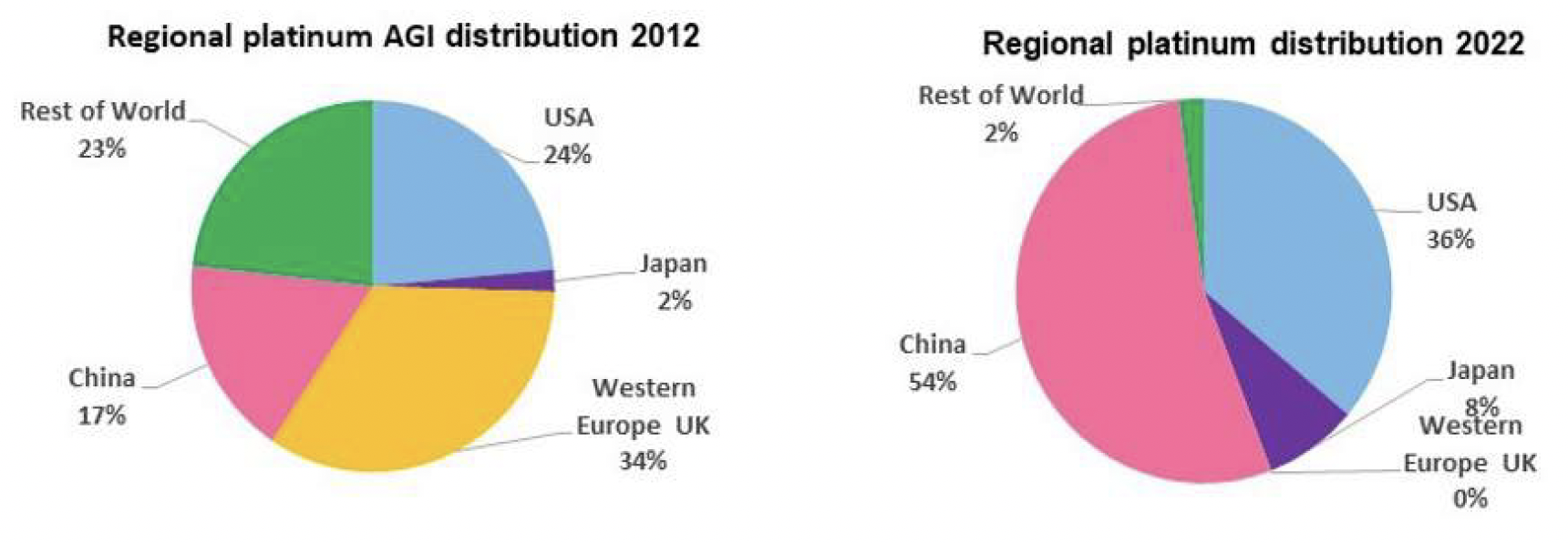 The quantum of platinum AGIs between regions has changed significantly from ~28.6moz to ~21.2moz between 2012 and 2022 (including China). This change is illustrated below: