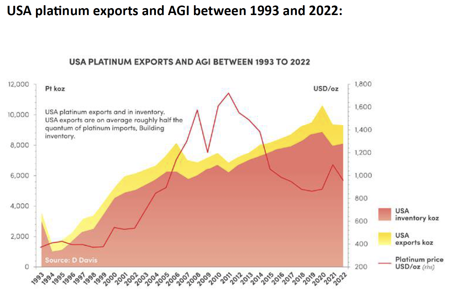 The USA has continued to build its platinum AGI at various rates over the period, as shown below. These changes go hand in hand to some extent with the rate of imports into the USA, as would be expected.