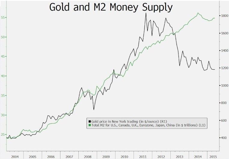 Gold’s price had an 89 percent correlation with the M2 totals during the past decade, according to a report by Walker and a dozen colleagues that had a similar chart. The comparable figure for U.S. M2 has been 83 percent since 1975, they added.