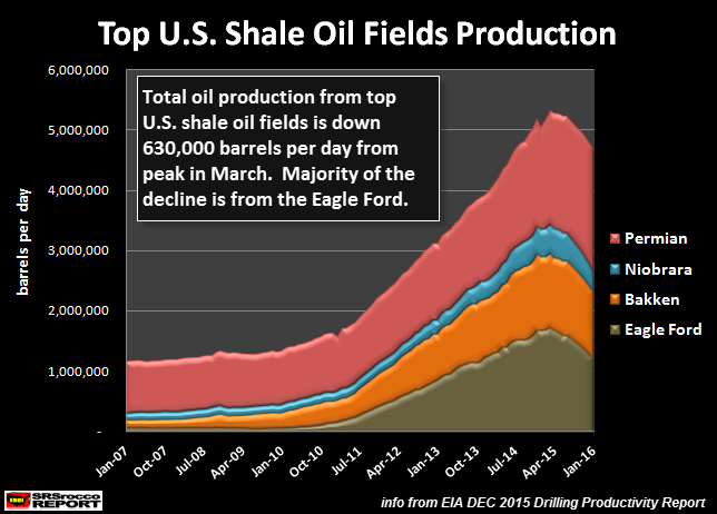 Total U.S. shale oil production in January 2016, is forecasted to be 4.67 mbd, down from the peak of 5.3 mbd in March 2015. This is a decline of 630,000 barrels per day from the peak.