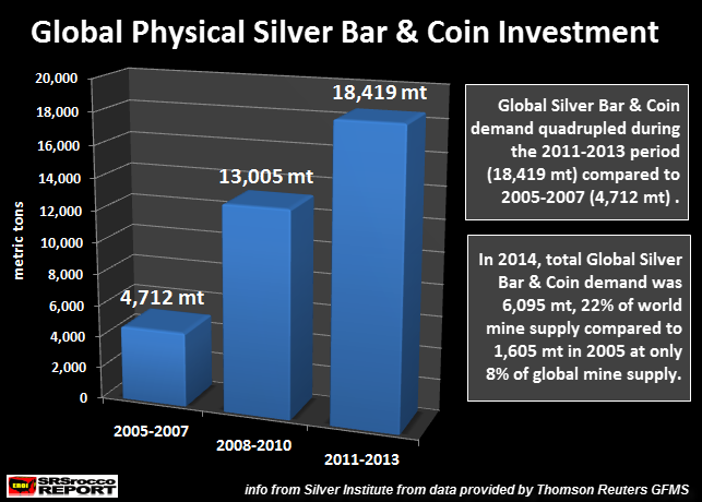 Before the U.S. Investment Banking and Housing Markets collapsed in 2008, investors only purchased 4,712 metric tons (mt) of silver bar and coin (151 Moz) during the three-year period from 2005-2007. Even though its been seven years since the collapse occurred, investors continue to by record silver bar and coin. As you can see, silver bar and coin demand nearly quadrupled 2011-2013 to 18,419 mt (592 Moz).