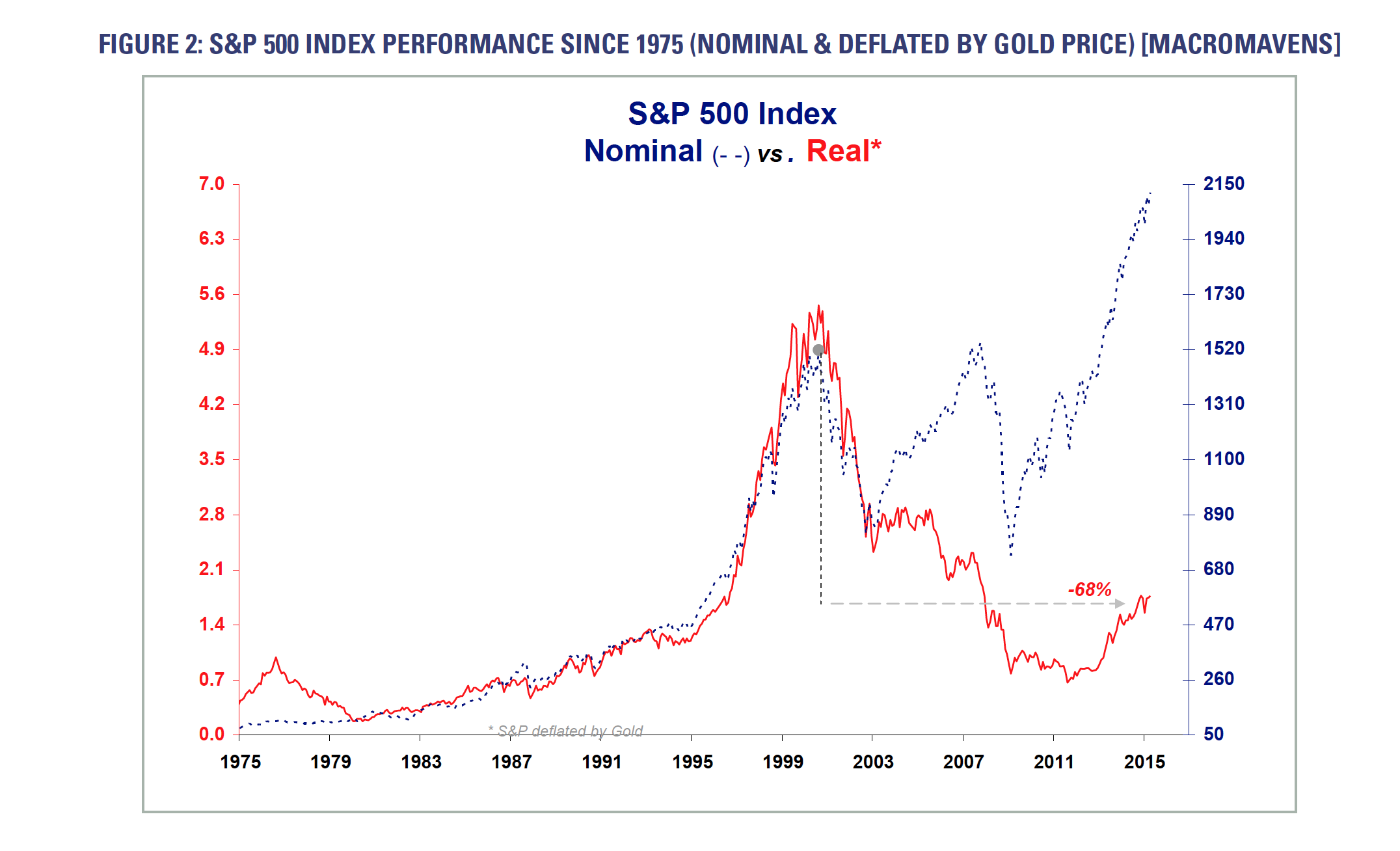 Now that the S&P 500 Index has more than tripled from March 2009 lows, the investment world is once again replete with portfolio gains from U.S. equities. We recognize few asset classes can challenge the pedigree of the S&P 500 Index, and even fewer investors would consider gold on par with the S&P 500 as an important portfolio building block. However, as shown in Figure 2, below, the fact remains that even at its current level of 2,112 (4/23), the S&P 500 Index is trading today 68% lower in gold terms than at its 2000 peak.