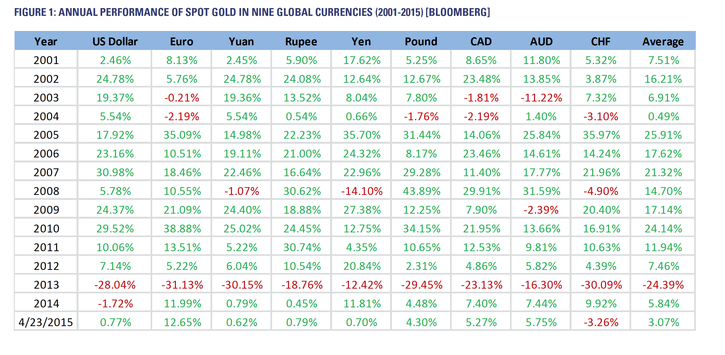 Gold is an asset without peer in terms of the sheer number of investment perspectives leading to its ownership. Some perceive gold as an inflation hedge, others as a deflation hedge. During times of financial stress, some view gold as an asset to own, while safe-haven U.S. dollar traders see gold as an asset to short. Many view gold as the ultimate “risk off” asset, and just as many view gold as the ultimate “risk on” trade. What can then explain gold’s meticulous advance versus prominent fiat currencies in all but one (2013) of the past 15 years, despite the myriad of economic, fiscal and monetary conditions which prevailed during those years?